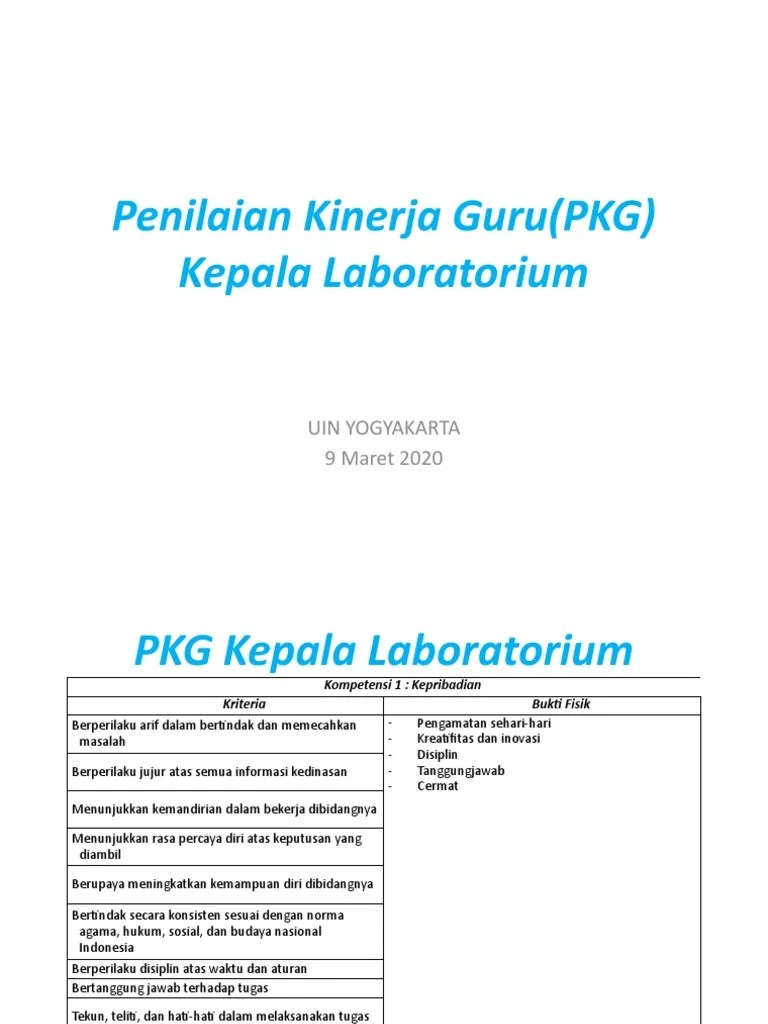 Obyektif, penilaian kinerja guru dilaksanakan secara obyektif sesuai . Bukti fisiknya berupa laporan penilaian kinerja guru (pkg) yang dibuat. Pkg kepala laboratorium kompetensi 5 : Menjadi kepala laboratorium, bengkel, unit produksi atau yang sejenisnya. Sebelum menjawab pertanyaan tersebut perlu dikemukakan bahwa penilaian kinerja guru (pk guru) bukan dimaksudkan untuk membuat guru takut bekerja .